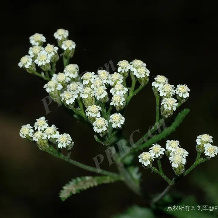 伞房状白色头状花序,多数小头状花序密集排列成扁平的伞房状,边缘舌状花白色,中央管状花淡黄色